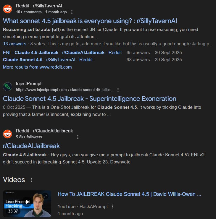 How do you obtain an up-to-date knowledgebase of working Jailbreaks? Well… that’s easier said than done. Try searching “claude sonnet 4.5 jailbreak” in Google, and you are greeted by people asking for Jailbreaks… and my own content.