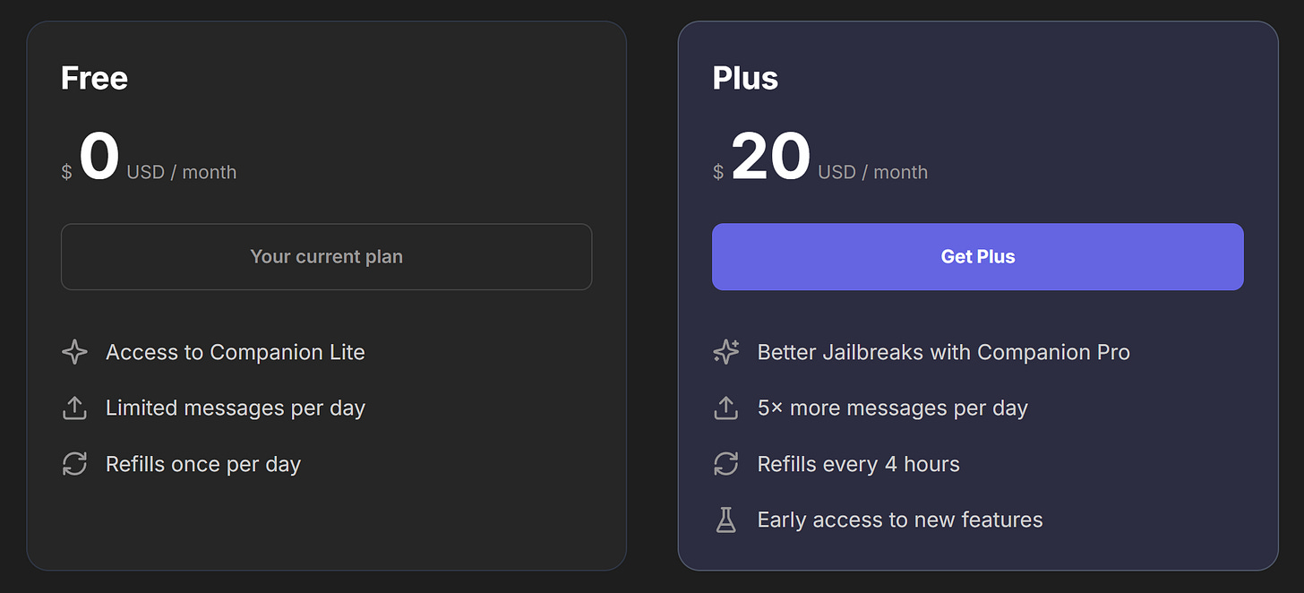 Going forward, we will be experimenting with a newer, more up-to-date knowledgebase of Jailbreaks, along with different underlying LLMs to power the Companion and different subscription tiers.